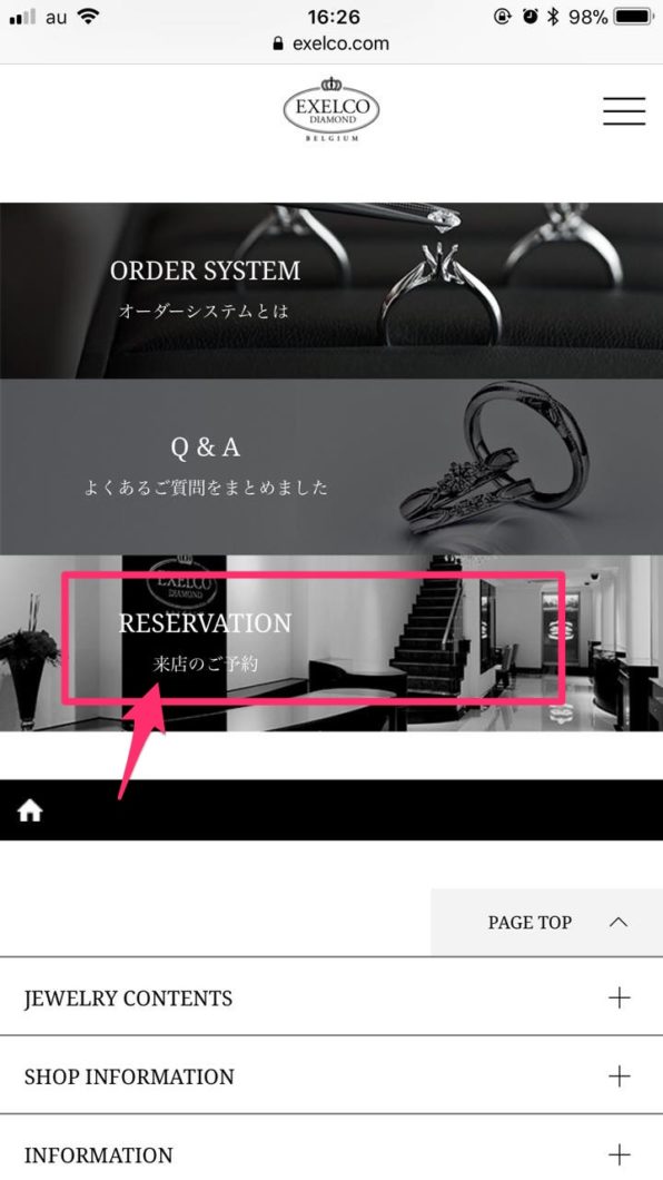 エクセルコダイヤモンドのサイトを開いたら、画面を下までスクロールして「来店予約」を押します。