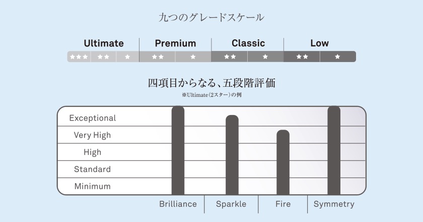 ダイヤモンドの輝き基準は客観的な評価が難しいのですが、