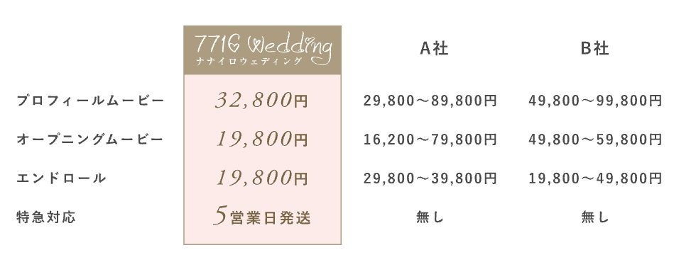 結婚式場専属業者のムービー料金の約半額程度でサービスを提供していてとてもリーズナブル。